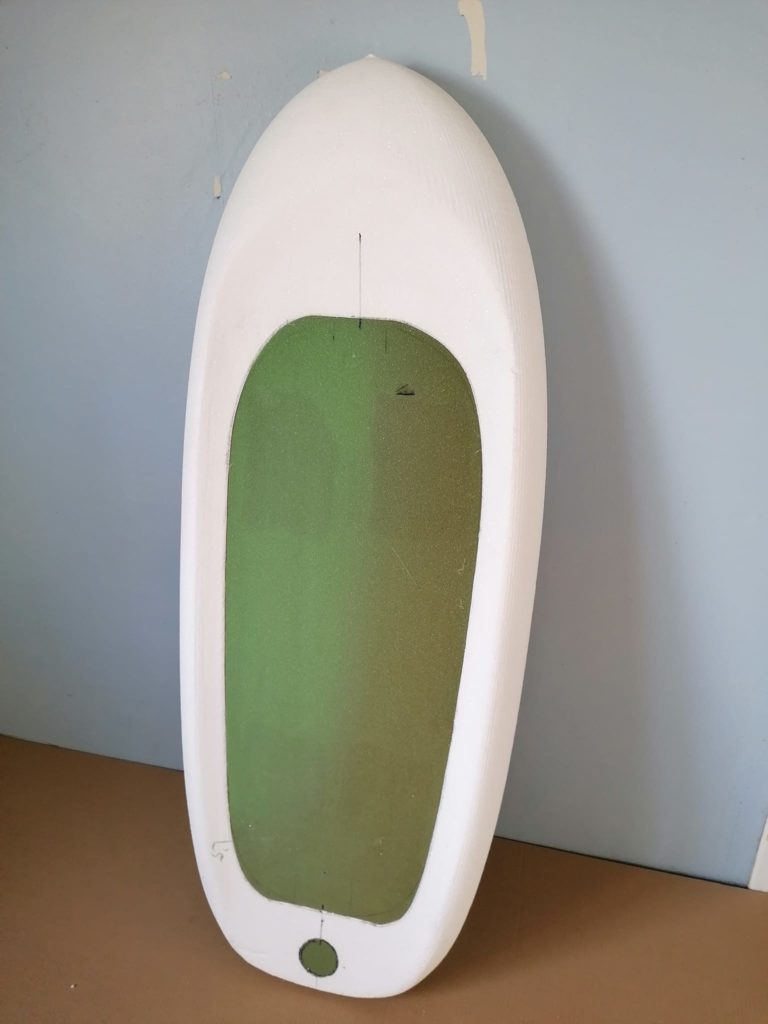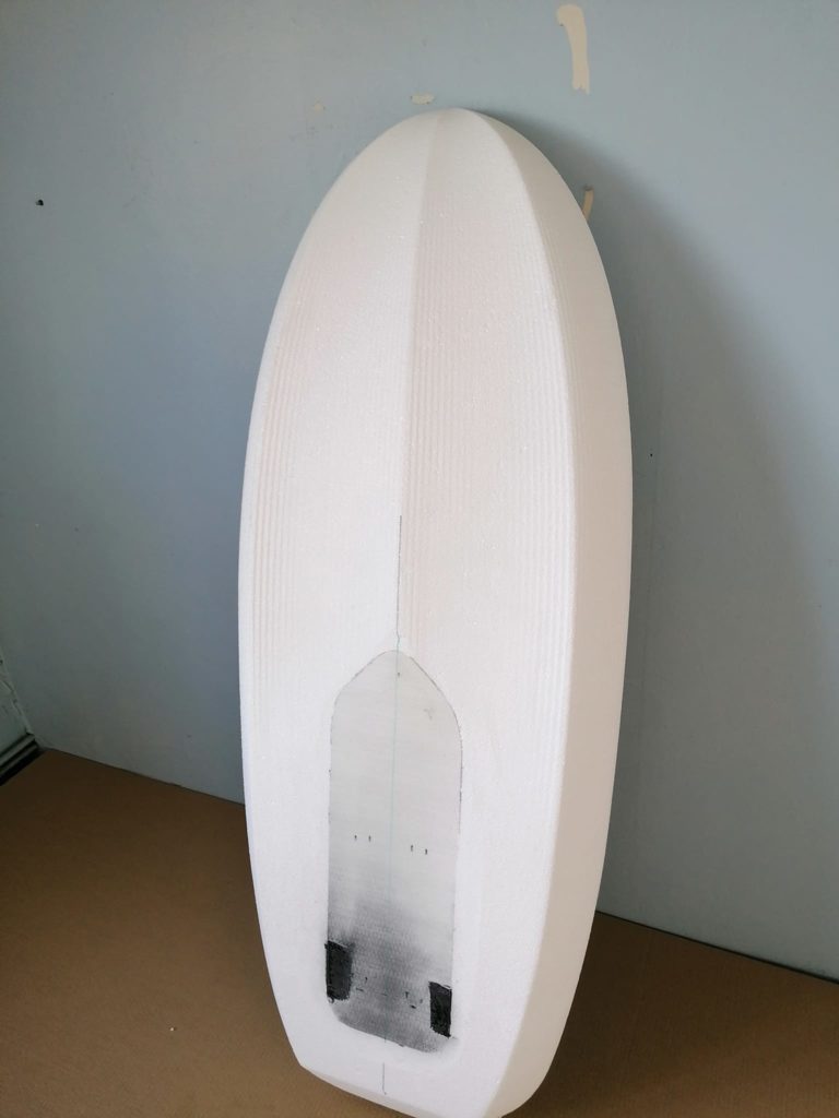 Les boitiers US de fixation du foil sont englobés dans une strat de carbone pour repousser tout risque de fissure ou de casse. Ces boitiers renforcés sont placés dans une épaisse couche de mousse haute densité, elle-même collée à l’époxy, et fibrée. Ce renfort garantit une très grande rigidité de la zone recevant le foil, offrant un transfert de forces régulier et efficace entre le foil, la planche et les appuis du rider.